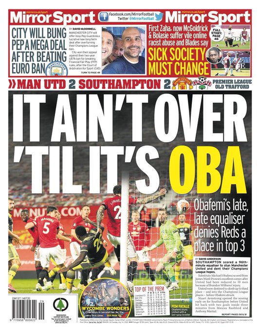Daily Mirror svänger till en Lenny Kravitz-hit med en twist. ”It ain’t over ’til it’s OBA”, som i Obafemi, vars kvittering på tilläggstid satte stopp för Man Uniteds segersvit (2-2 mot SouthamptonVictor Nilsson Lindelöf var…någorlunda). Låten skulle kunna ha återanvänts till ”It ain’t over ’till it’s OBLAK”. I alla fall hävdar Mirror – ”exklusivt” – att Chelsea är beredd att erbjuda Kepa Arrizabalaga plus cash för att hämta in målvakten Jan Oblak från Atlético. Slovenens utköpsklausul ligger på 120 miljoner euro. Tidigare har The Athletic uppgett att Chelsea är i kontakt med Ajax-målvakten André Onana. Men dagen tillhör varken Oba eller Oblak. Den tillhör Manchester City. Efter firandet av CAS-domen planerar klubben att erbjuda Guardiola ett nytt långtidskontrakt, hävdar Mirror.