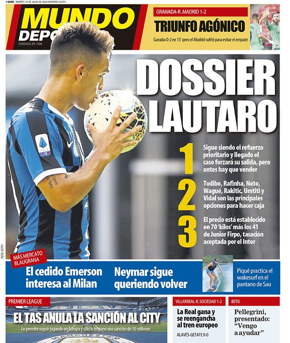 Mundo Deportivo understryker just att Barça inte gett upp Interanfallaren. I ”Dossier Lautaro” ritar tidningen upp tre steg. 1/ Sälja en annan anfallare för att skapa utrymme för argentinaren. 2/ Använda Todibo, Rafinha, Neto, Wagué, Rakitic, Vidal eller Umiti i bytesdeal. 3/ Ett bud på 70 miljoner euro plus Junior Firpo som värderas till 41 milj euro.