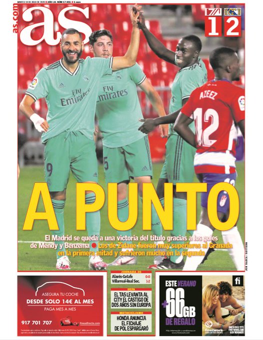 Marca har ”Titeln i sikte”, efter Real Madrids seger på måndag kväll (2-1 mot Granada). Det var lagets nionde raka seger, och Zidanes mannar är nu bara en seger från att säkra ligatiteln. Det hindrar inte Marca från att än en gång reta upp sig på Gareth Bale, ”som gjorde ännu fler barnsliga gester på läktaren” i samband med gårdagens match. Den bänkade walesaren formade den här gången händerna som en kikare mot spelarna på planen, med en toapappersrulle i den ena handen. I matchens dessförinnan lutade han sig tillbaka och lade en ansiktsmask över ansiktet. Marca fortsätter indignerat: ”En del närvarande försäkrar också att han tittar åt andra hållet när matchen pågår och visar att han är totalt bortkopplad från laget”. Bale har kontrakt till 2022.