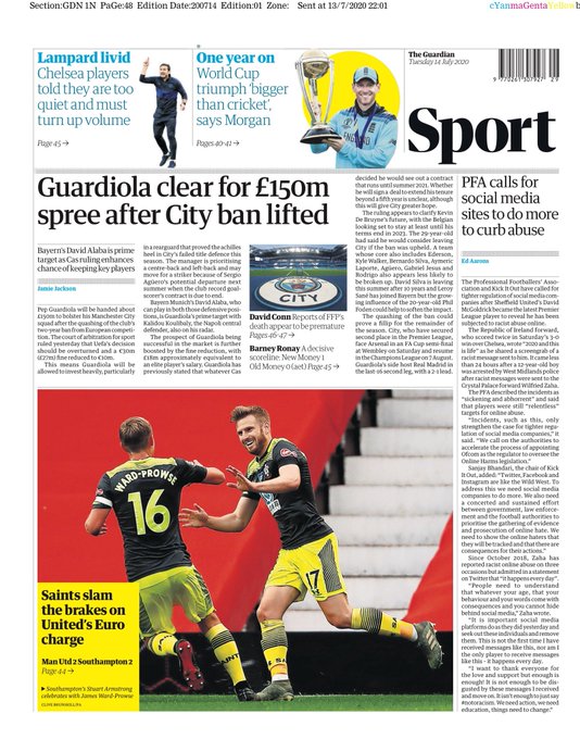 The Guardian konstaterar att Förenade Arabemiraten förutom att fylla på Peps bankkonto också kommer att fylla på hans spenderarbrallor. ”Guardiola får klartecken att värva för 150 miljoner pund sedan avstängningen hävts”. I topp på listan är David Alaba från Bayern München.